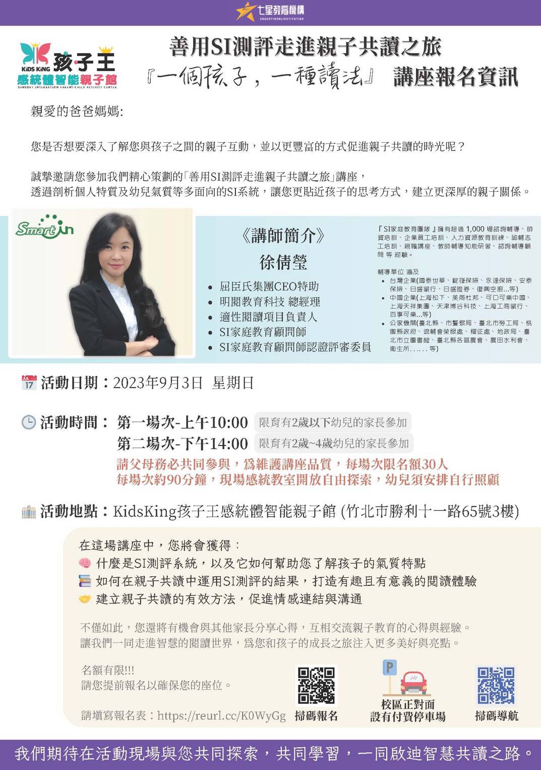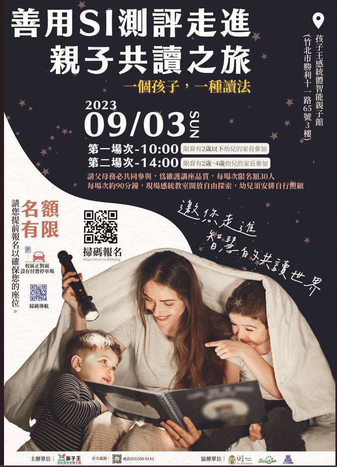 邀請您參加9/3 (日)SI 測評活動,幫助您了解孩子的氣質特點,增進親子互動~ 找到適合寶貝的閱讀模式,讓閱讀變成「悅」讀,父母不同的性格,也會有不同的共讀模式喔! ❣️費用完全免費,歡迎掃碼報名 孩子王 全體老師誠摯邀請您